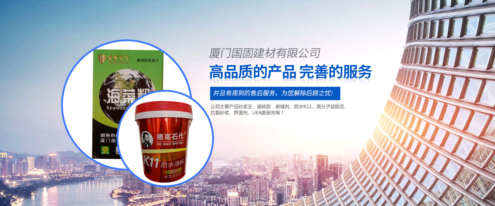 ??廈門國固建材有限公司是集科研開發,生產為一體的混凝土外加劑科技生產單位,公司技術力量雄厚,工藝科學先進,產品質量及性能在全國同行業中。并且有周到的售后服務,為您解除后顧之憂。本廠生產的產品,科技含量高,質量穩定,檢驗嚴格,其主要技術指標經福建建筑科學院嚴格鑒定測試后均達到國標標準。是目前水泥制品中理想的名加劑產品,適用道路、橋梁、工業與民用建筑,對鋼筋無繡蝕、具有良好的經濟及環保效益,是國家建筑學會積極推廣的外加劑產品。本廠推廣標準化,規范化、程序化管理、具有健全、完善、持續穩定運行的質量保證體系。產品遠銷上海、江蘇、浙江、廣州、北京、江西、安徽、福建等地,在大批國家建設工程中應用效果良好,并以性能優越、質量可靠、以及良好的售后服務在市場上享有很高的信譽。本廠在今后的歷程中,將一如既往的為您提供高質量、高科技的產品,完善的服務以感謝廣大客戶的支持和厚愛。“科技創新、以誠為本,用戶滿意”是我公司發展的永恒目標,我們堅持“以誠結情、質量取勝”,以高品質的產品回報社會?!坝每婆d建材,創優品工程”,期待與各界朋友與時俱進,努力開拓進取,力求為用戶提供“高品質的產品,完善的服務”。公司愿與設計部門、建設單位、施工企業及同行們攜手合作,共創未來,共鑄輝煌、公司主要產品砂漿王、瓷磚膠,嵌縫劑、防水K11、高分子益膠泥、抗裂砂漿、界面劑、UEA膨脹劑等!